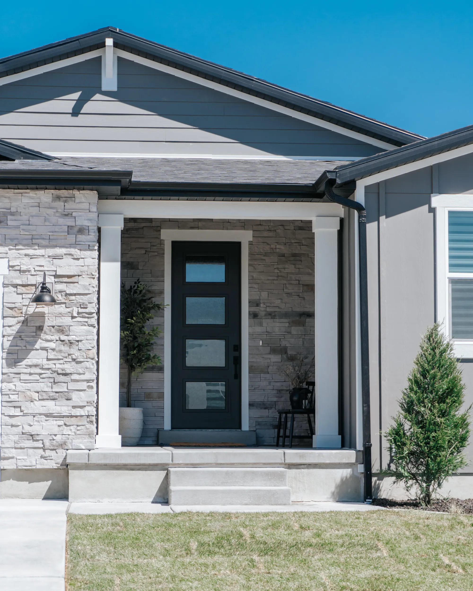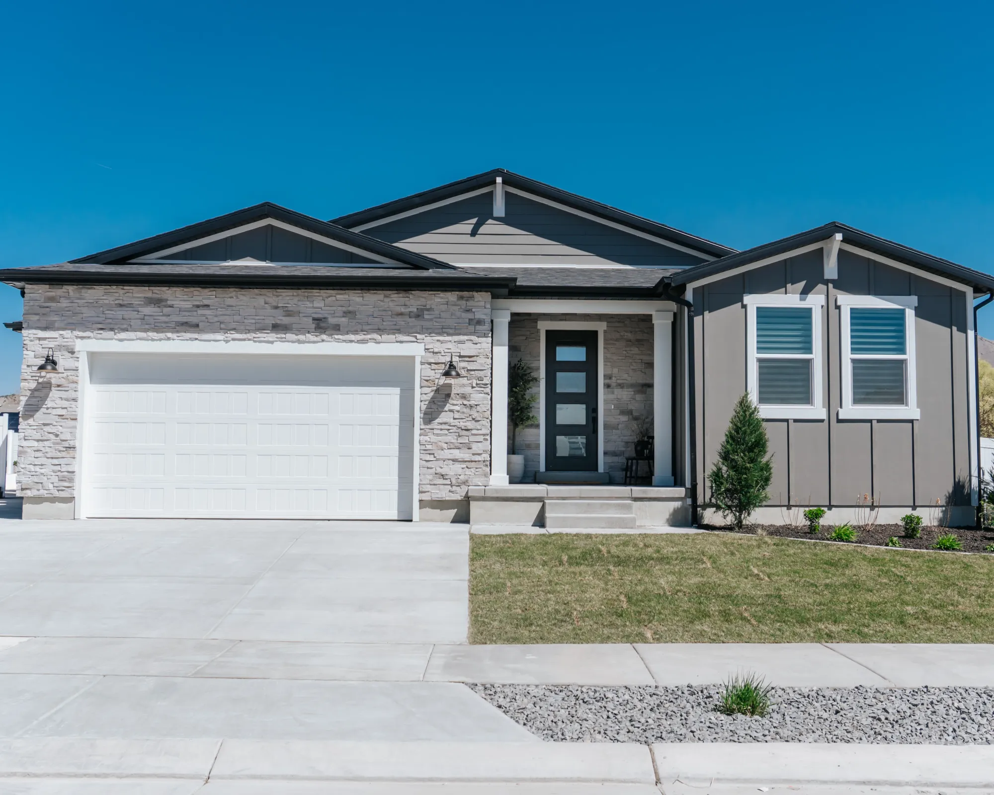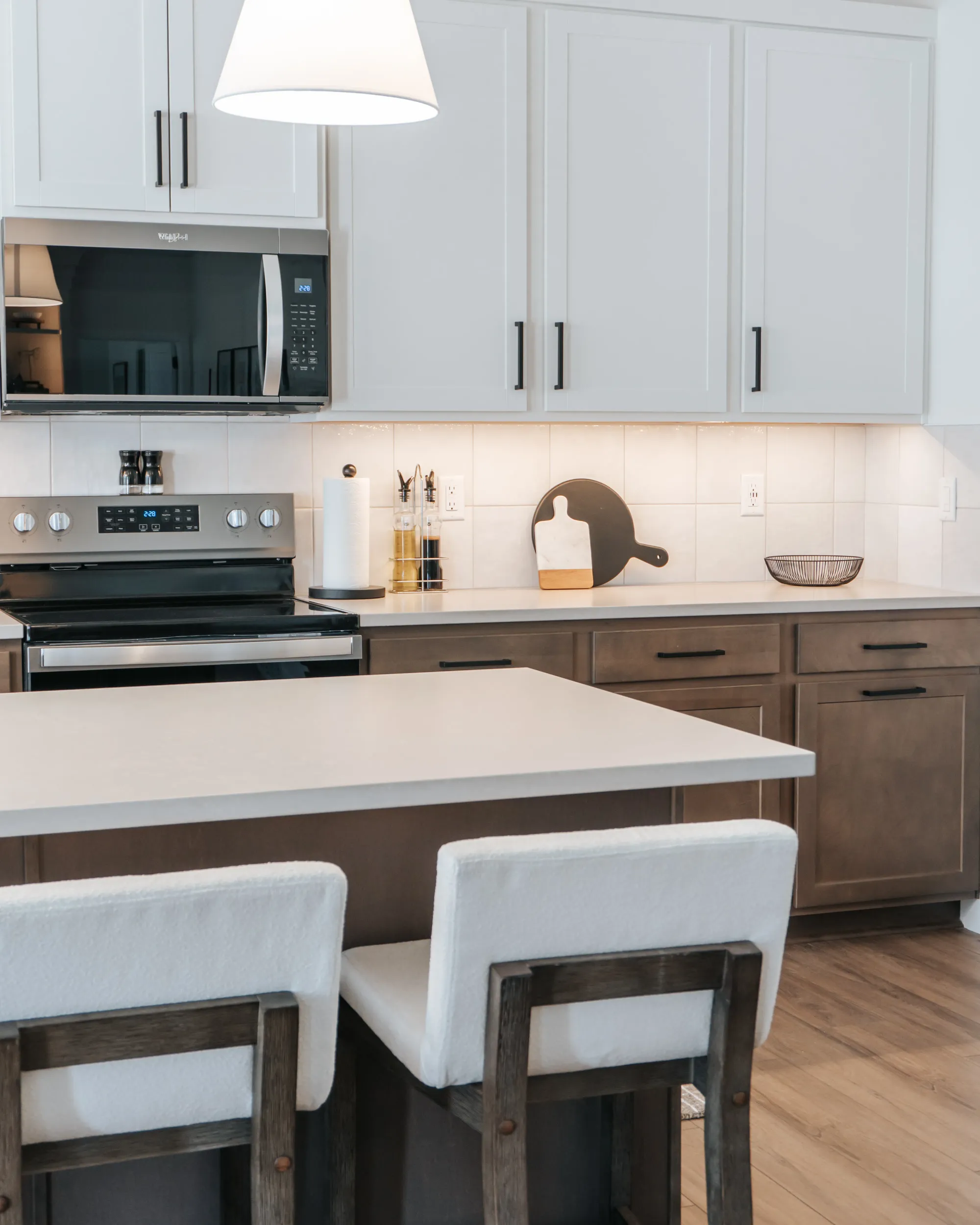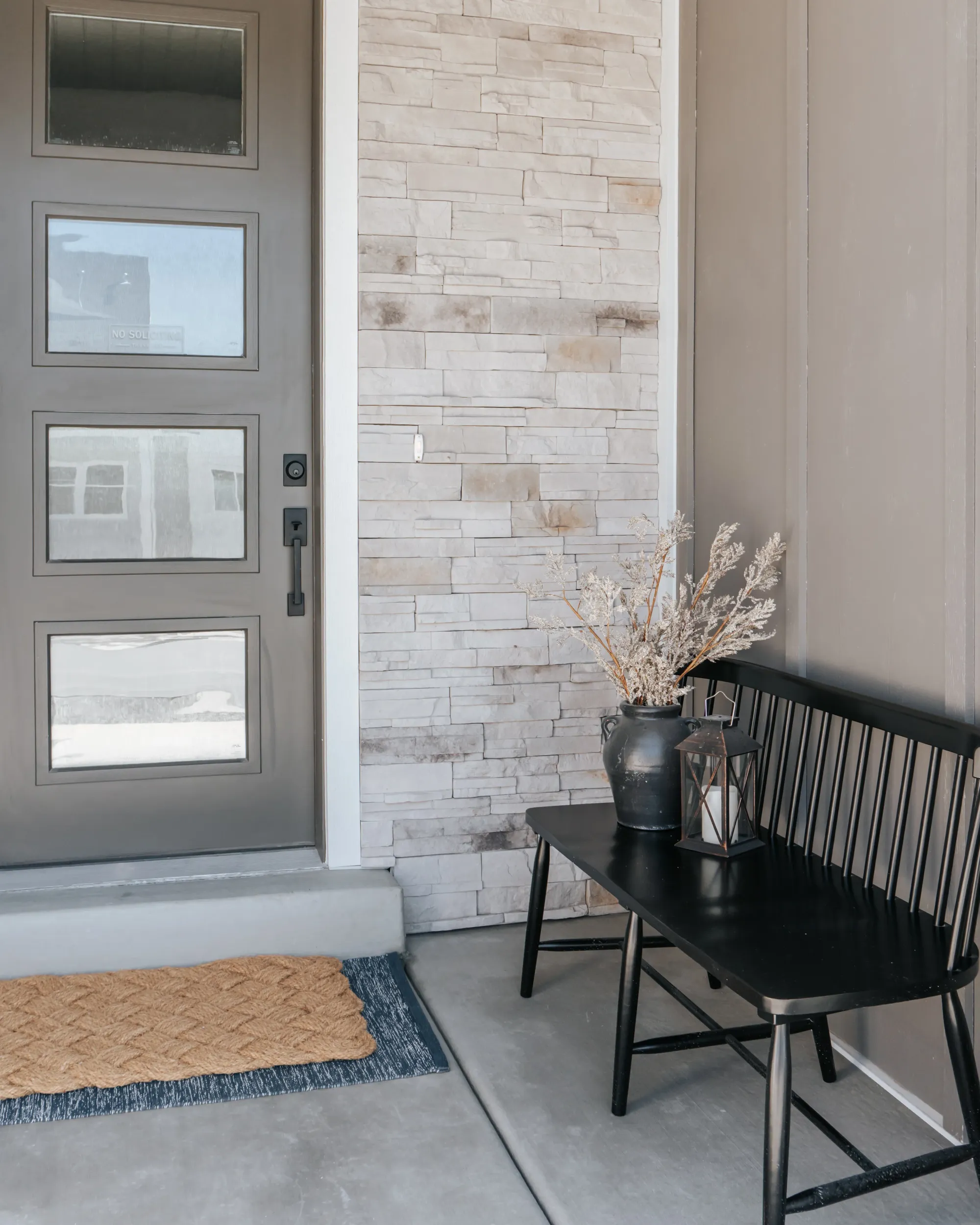 At our West Meadows project we were tasked with the goal to make a cozy yet modern bachelor pad. The neutral color palette — grays, whites, and stone — makes it look modern and easy to style.