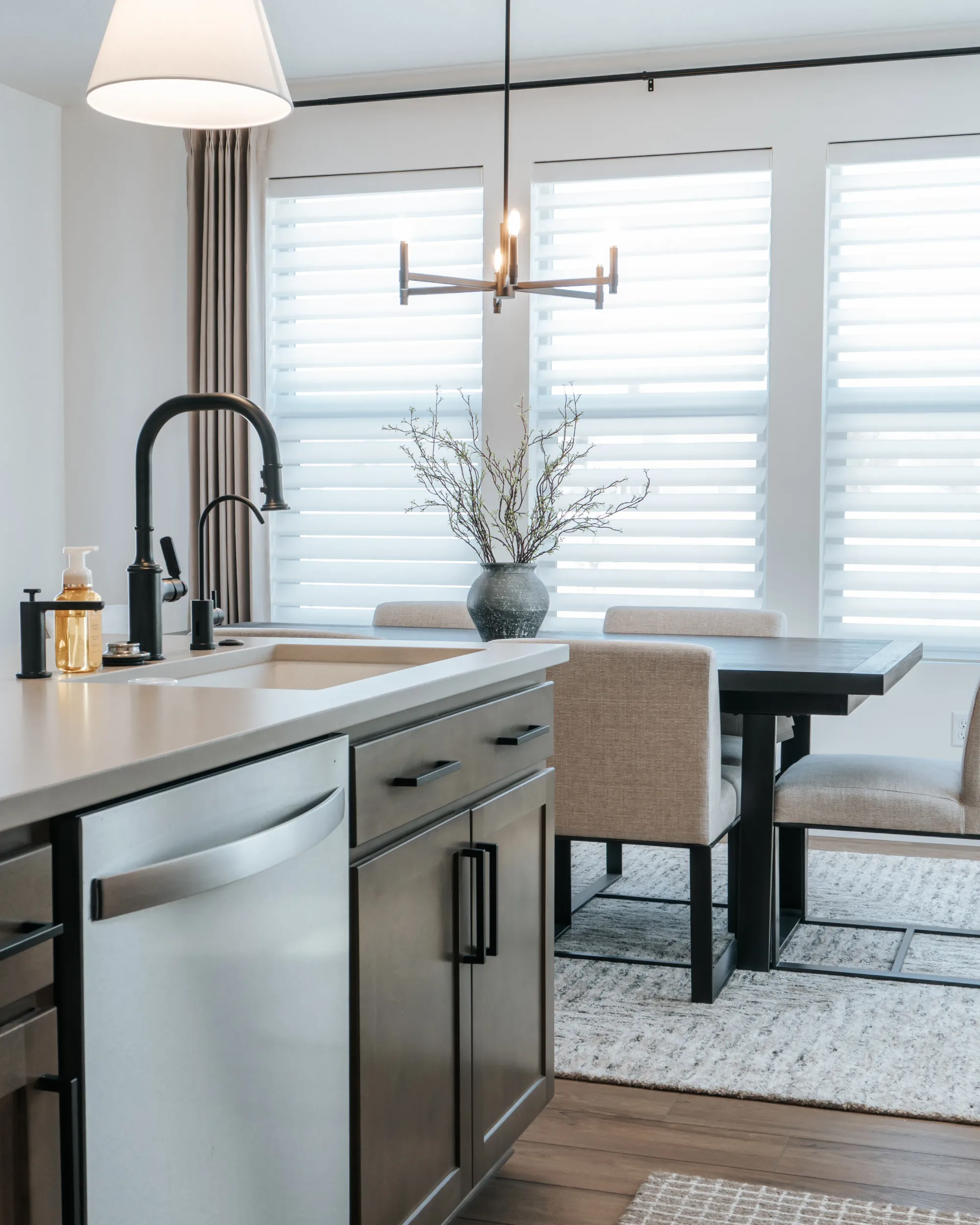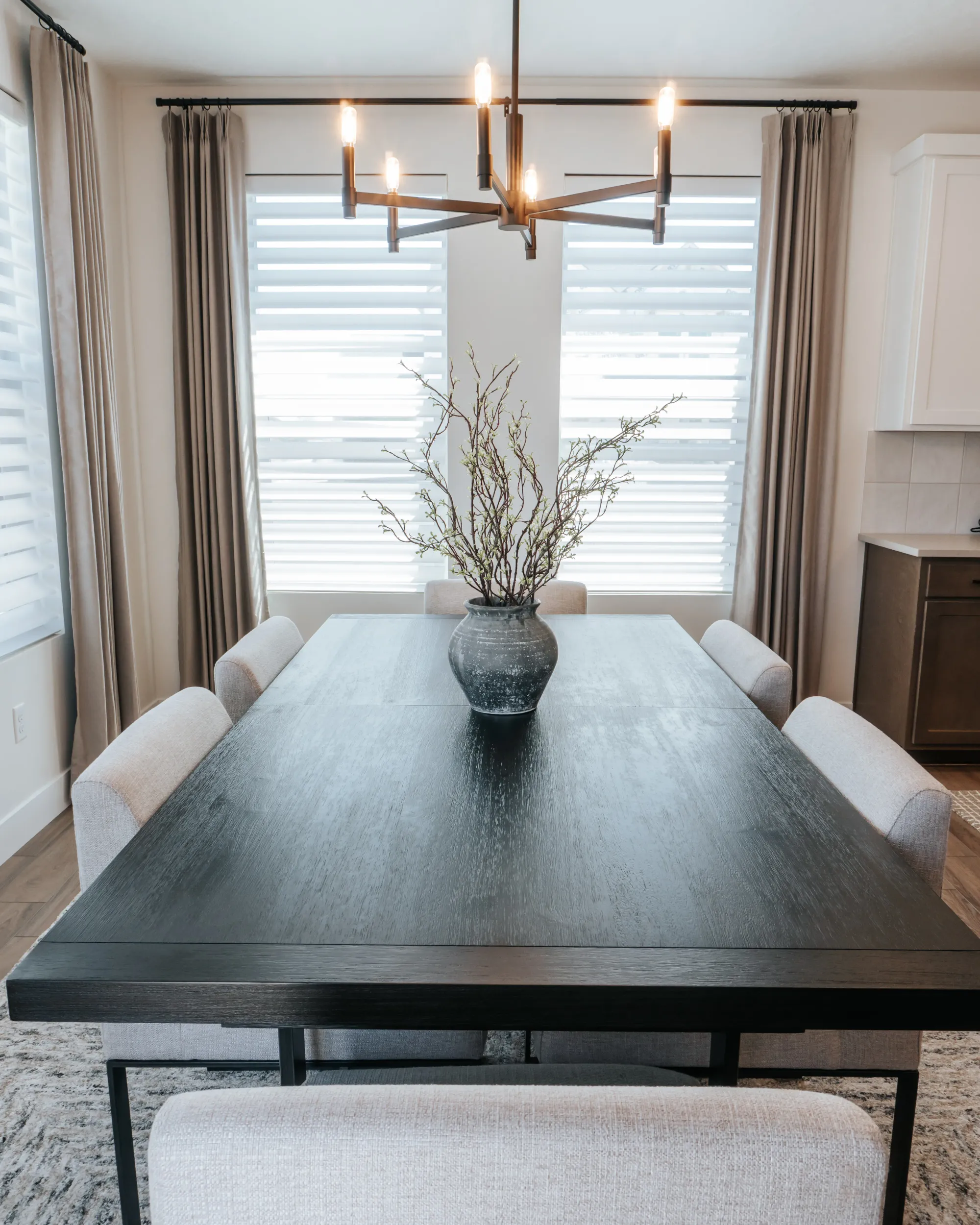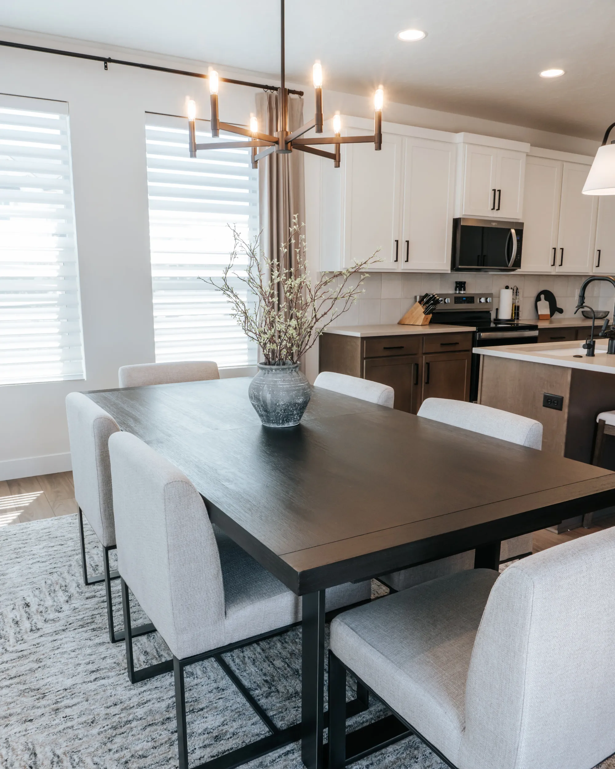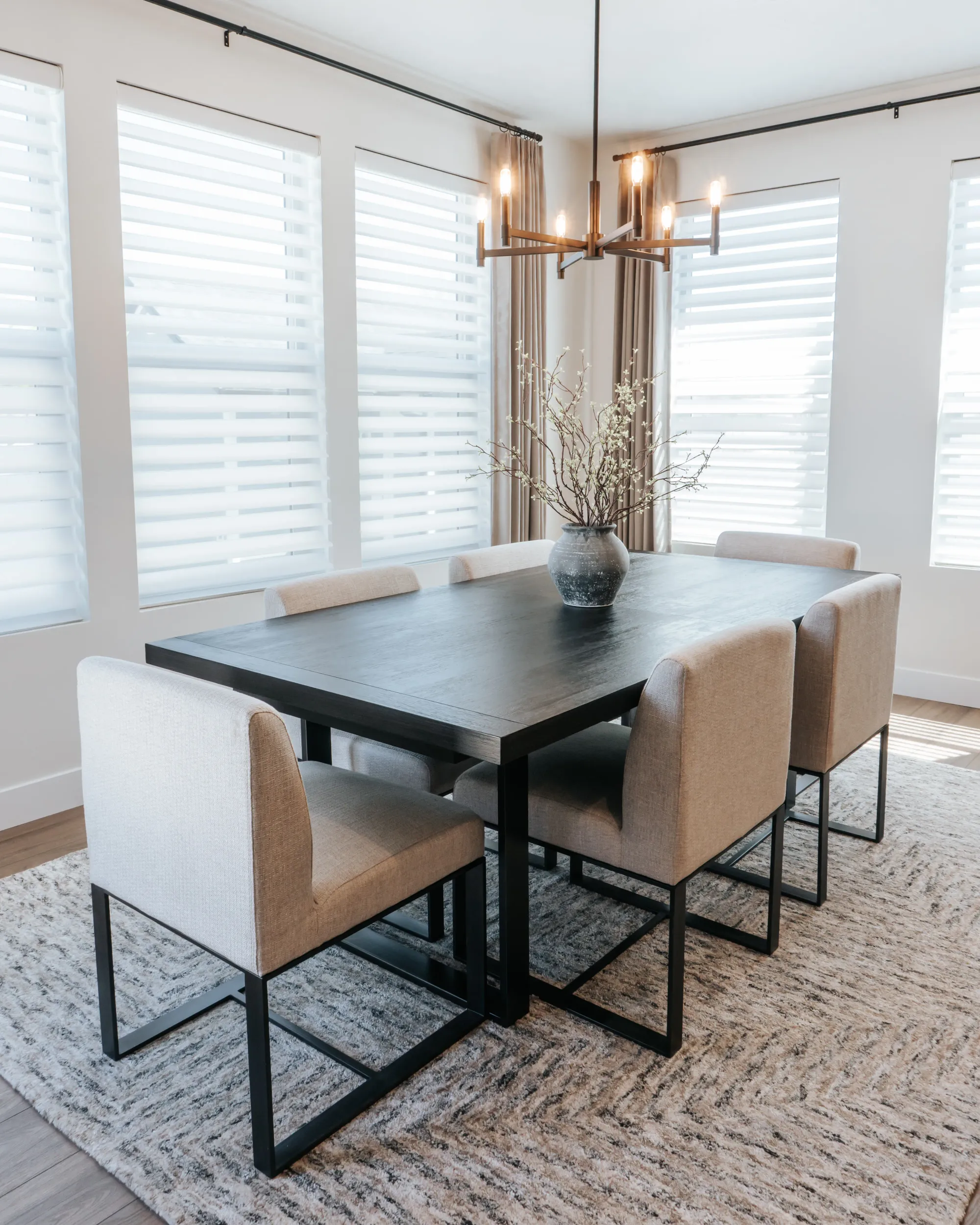 The interior of the home features a bright, modern design with a clean and cohesive neutral palette of whites, browns, and black accents. The dining area feels airy and inviting, with large windows, soft layered window treatments, and a sleek dark wood table surrounded by upholstered chairs, all anchored by a contemporary chandelier.
