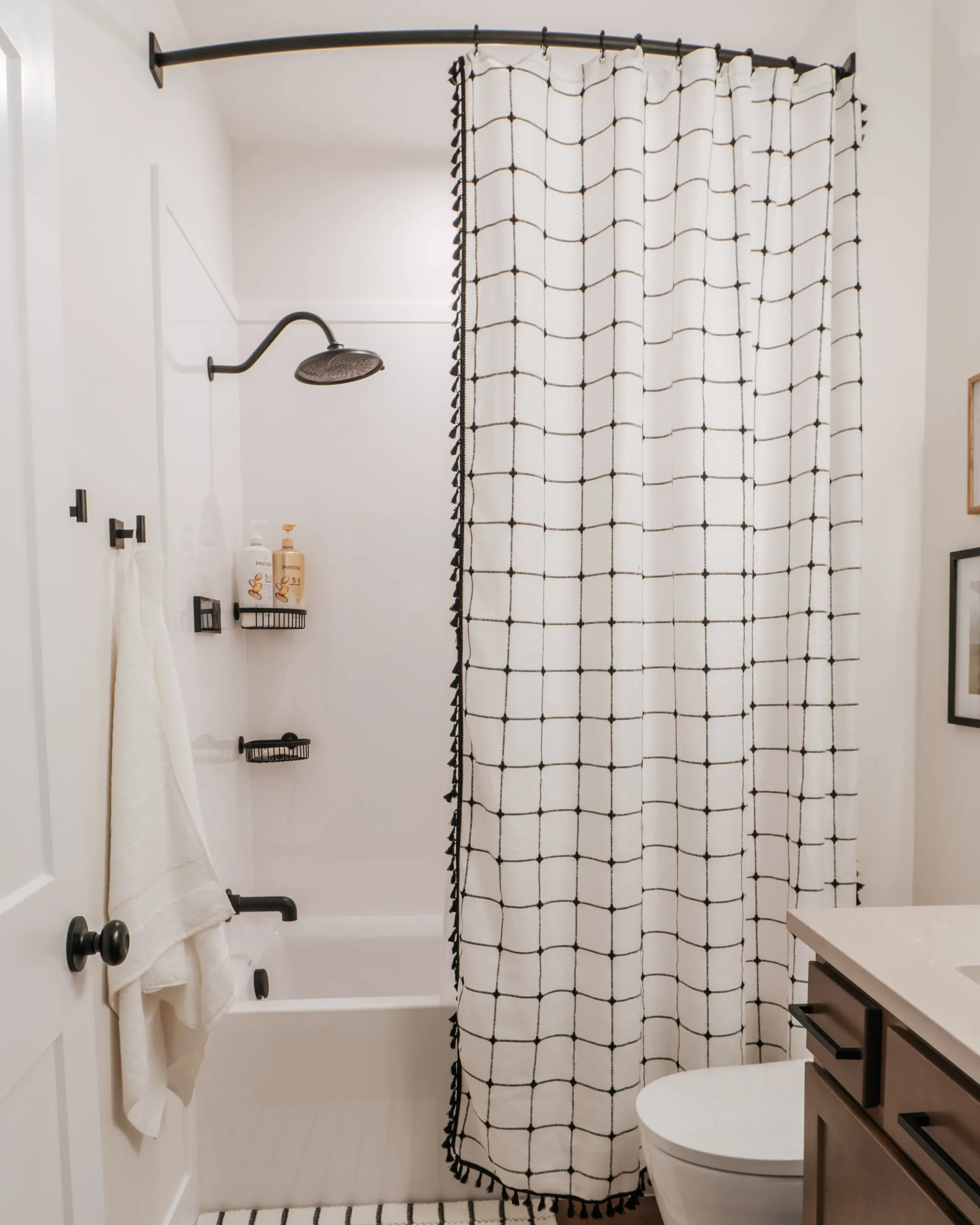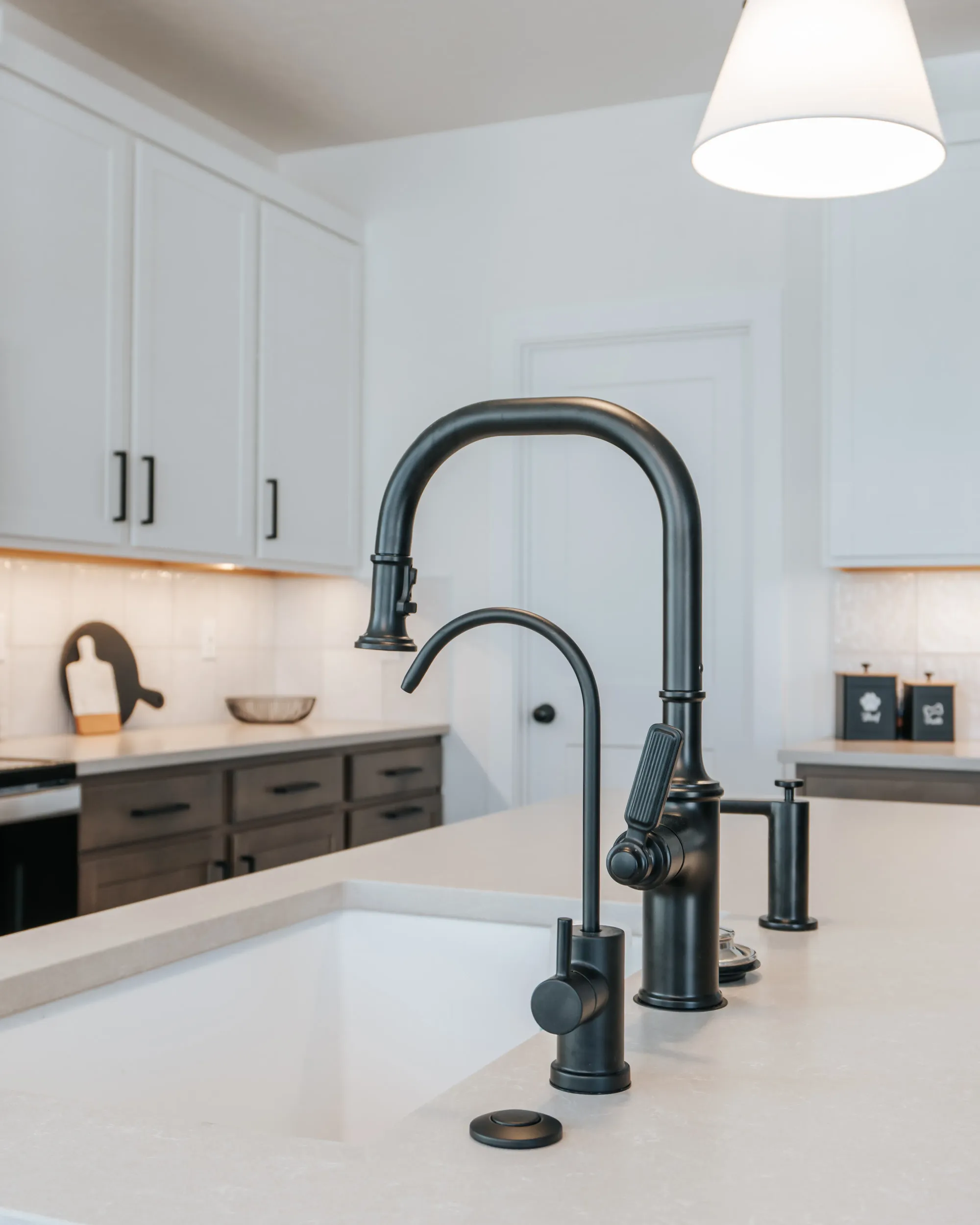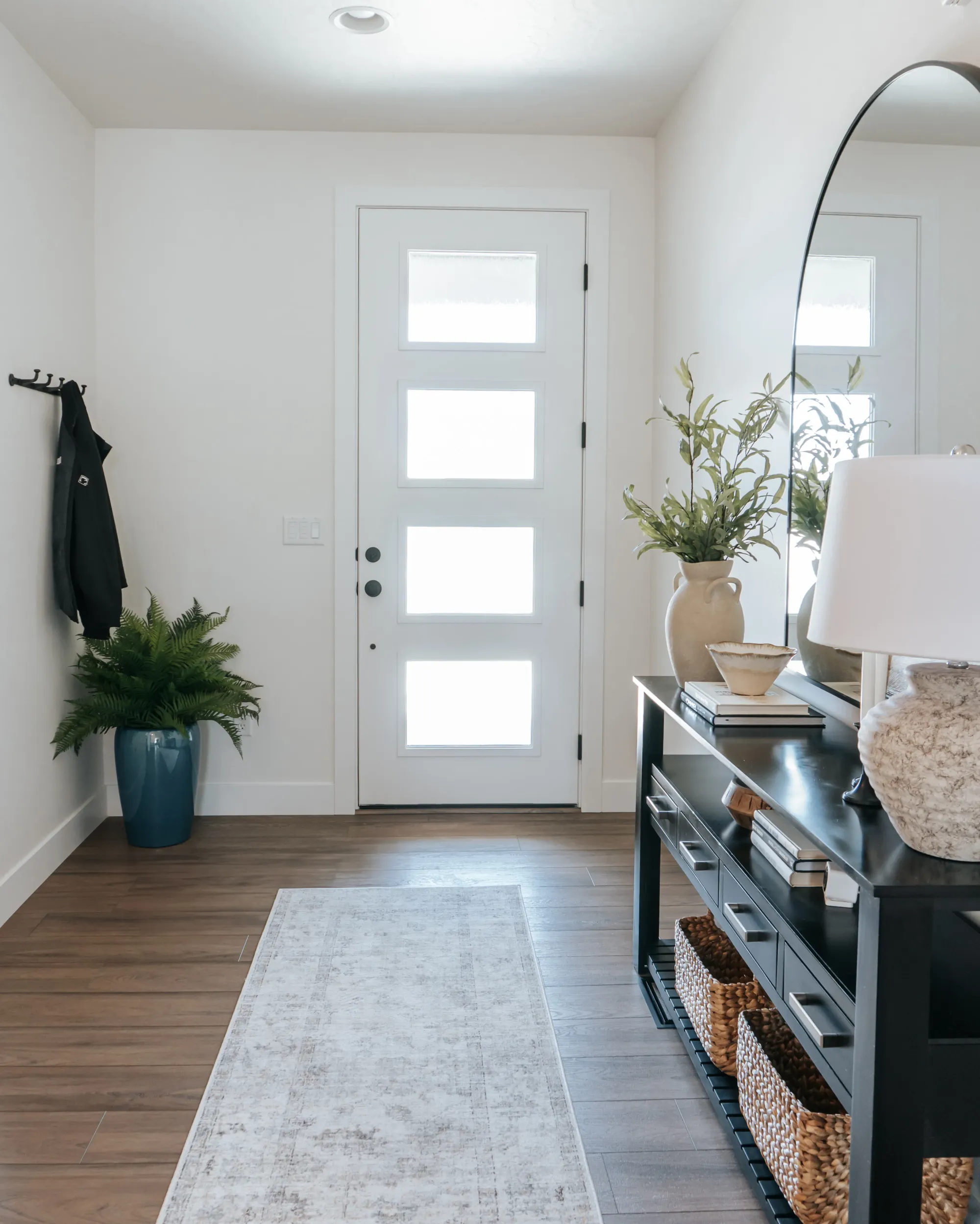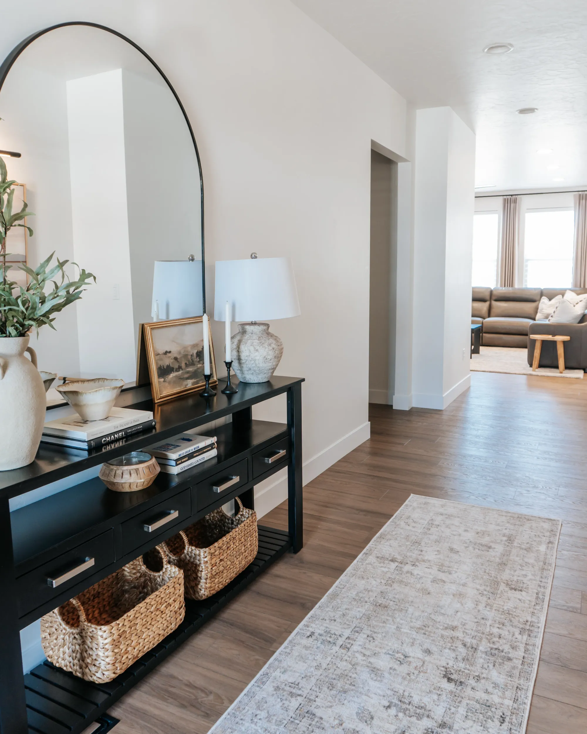 The interior of the home features a bright, modern design with a clean and cohesive neutral palette of whites, browns, and black accents. The dining area feels airy and inviting, with large windows, soft layered window treatments, and a sleek dark wood table surrounded by upholstered chairs, all anchored by a contemporary chandelier.