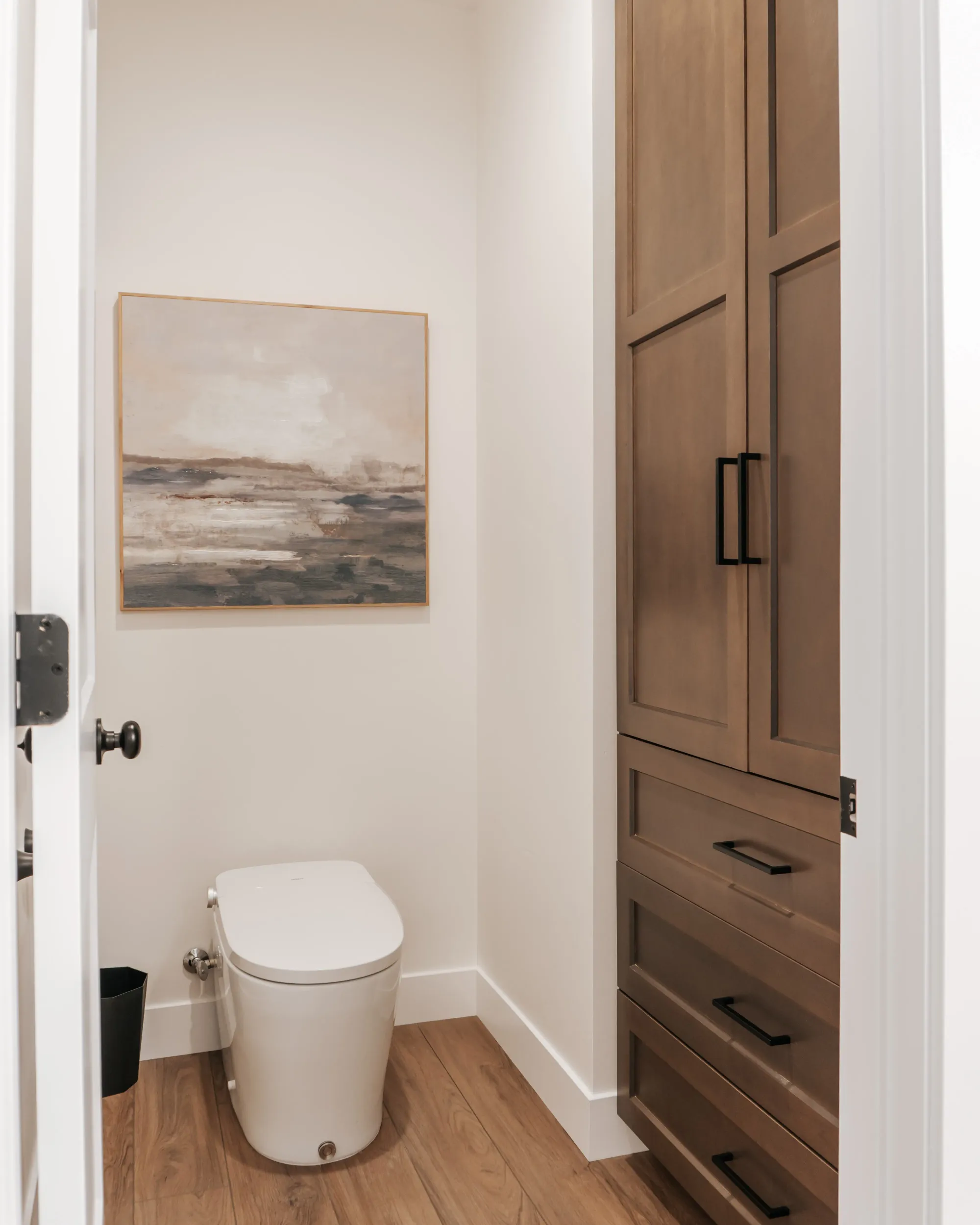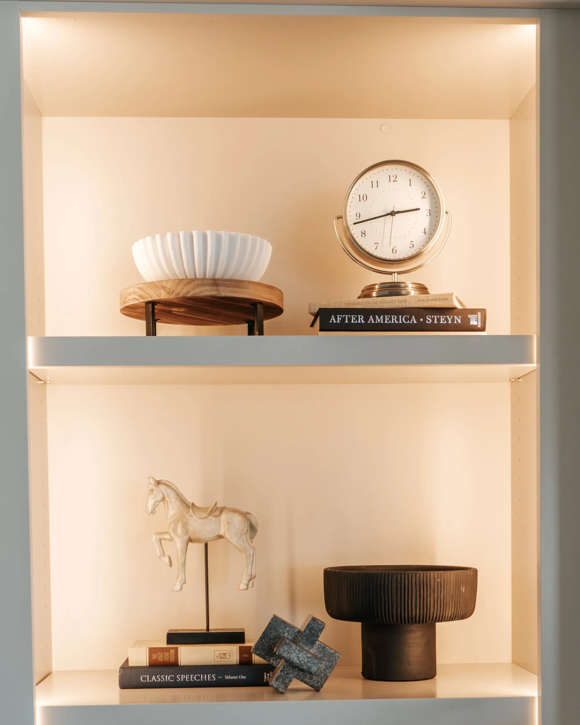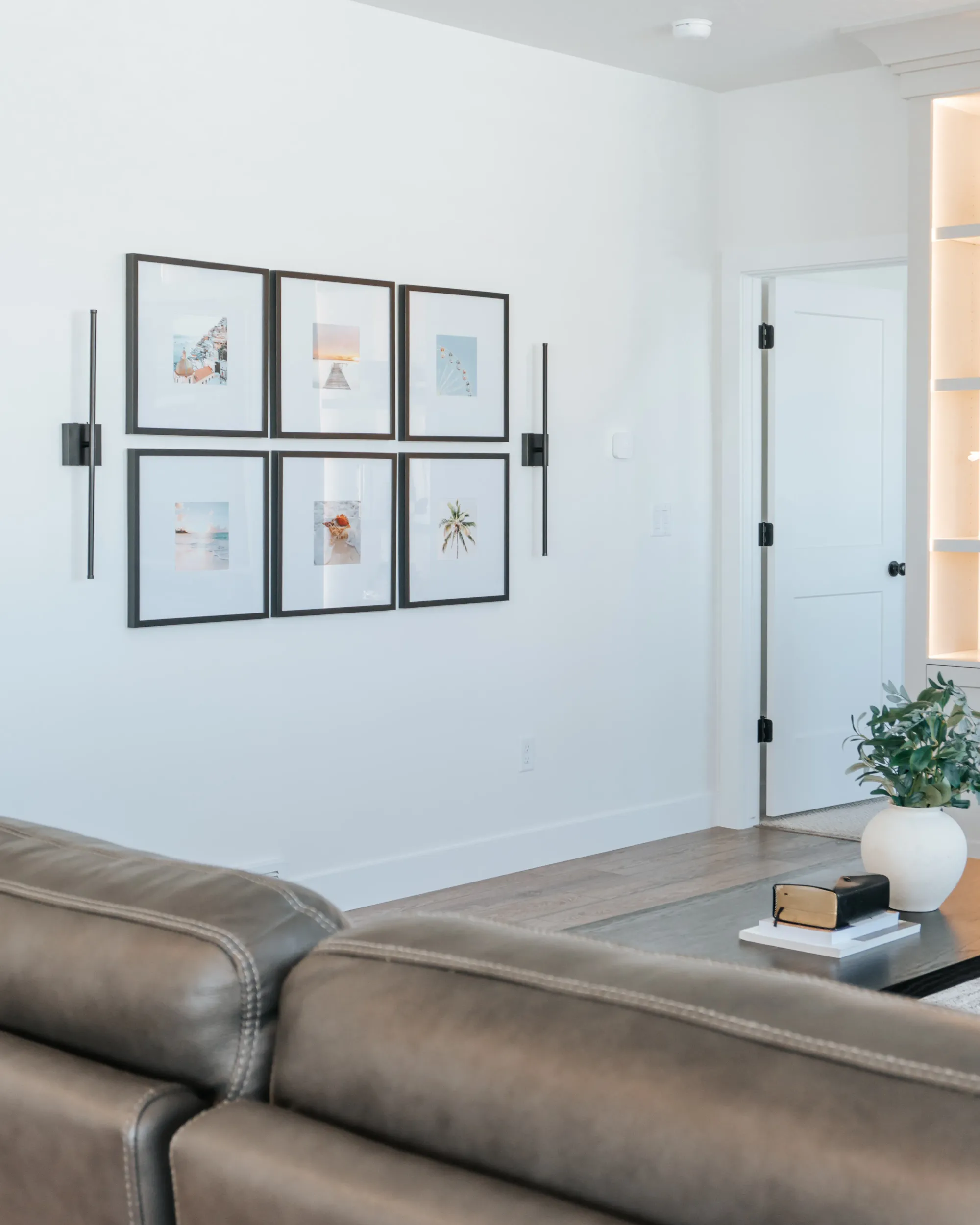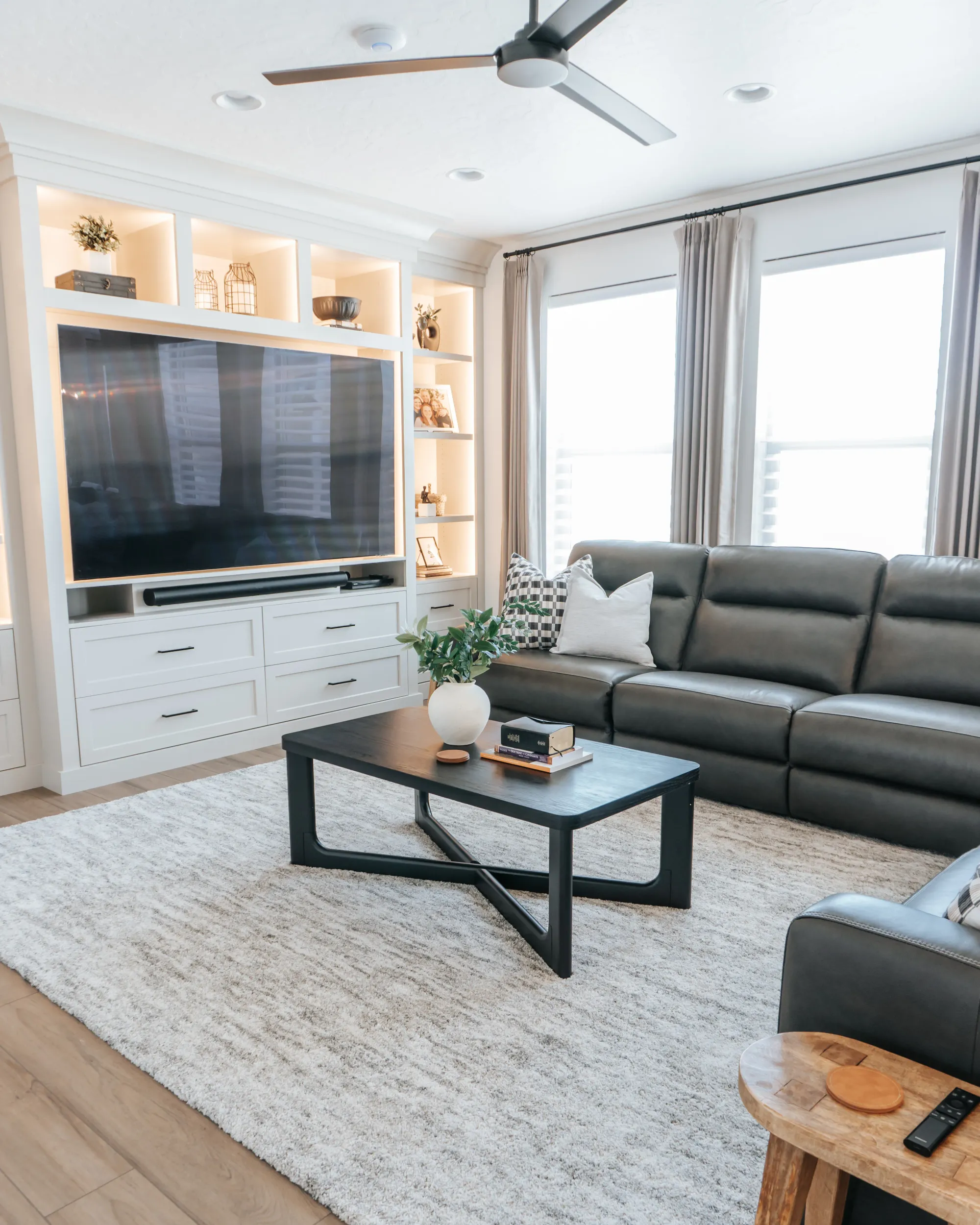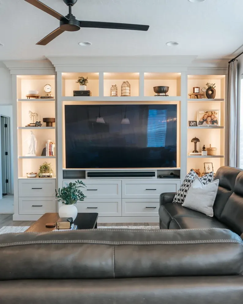 Flowing into the living space, a custom built-in entertainment wall creates a polished focal point with warm backlighting, open shelving, and crisp cabinetry. The combination of natural light, soft textures, and minimal yet curated décor gives the home a cozy but elevated feel — stylish, functional, and perfectly suited for everyday living and entertaining.